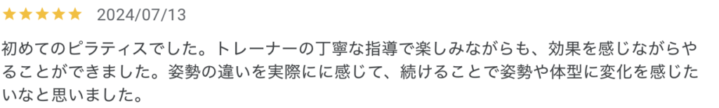 初めてのピラティスでしたが、トレーナーの丁寧な指導で、楽しみながら効果を感じることができました。