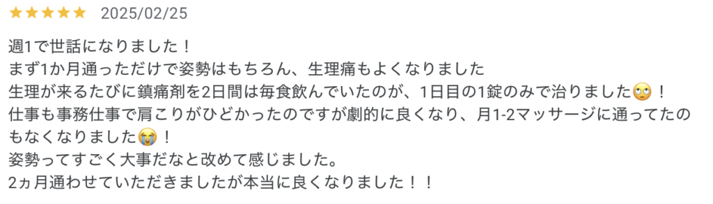 生理痛や肩こりまで楽になったとのこと、